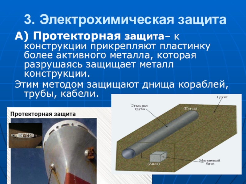 А) Протекторная защита– к конструкции прикрепляют пластинку более активного