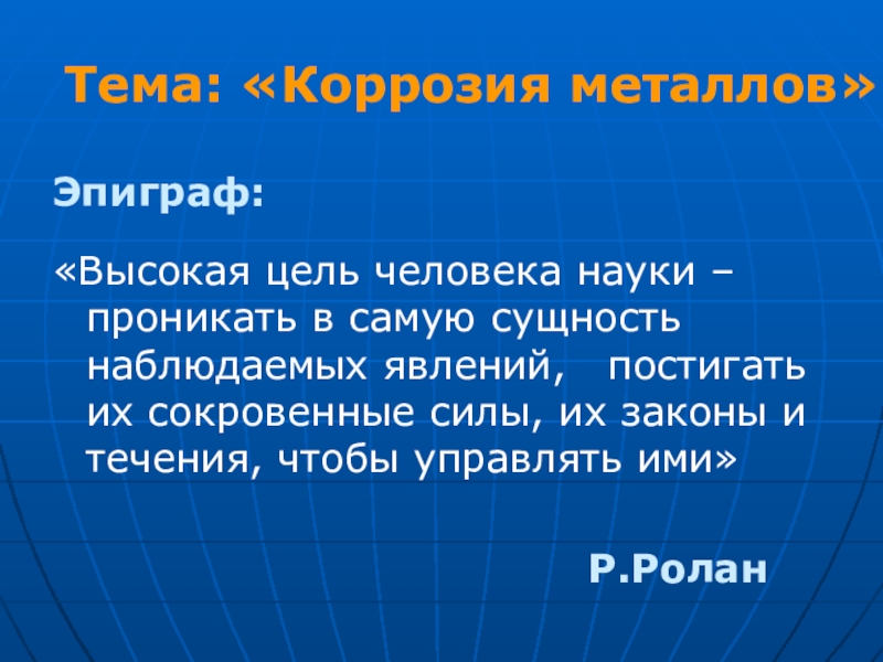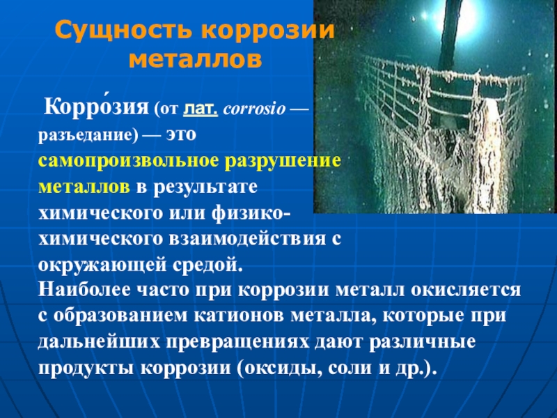Корро́зия (от лат. corrosio — разъедание) — это самопроизвольное разрушение металлов в результате химического или физико-химического взаимодействия с окружающей средой.