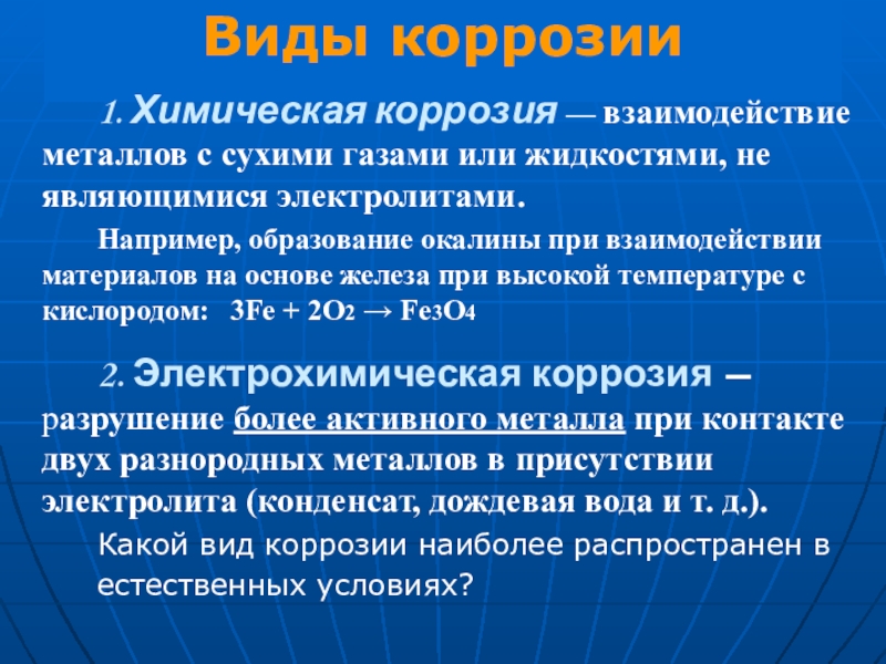 1. Химическая коррозия — взаимодействие металлов с сухими газами или жидкостями,