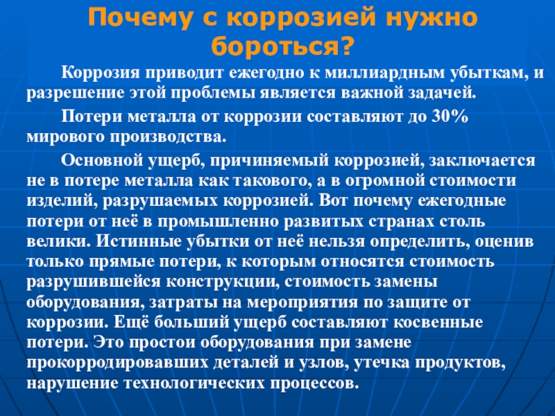 Основной ущерб, причиняемый коррозией, заключается не в потере металла как такового, а в огромной стоимости изделий, разрушаемых коррозией. Вот почему ежегодные потери от неё в промышленно развитых странах столь велики. Истинные убытки от неё нельзя определить, оценив только прямые потери, к которым относятся стоимость разрушившейся конструкции, стоимость замены оборудования, затраты на мероприятия по защите от коррозии. Ещё больший ущерб составляют косвенные потери. Это простои оборудования при замене прокорродировавших деталей и узлов, утечка продуктов, нарушение технологических процессов.