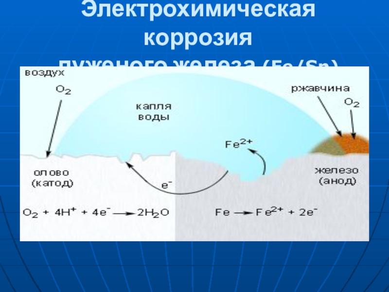 2. Электрохимическая коррозия — разрушение более активного металла при контакте двух разнородных металлов в присутствии электролита (конденсат, дождевая вода и т. д.).