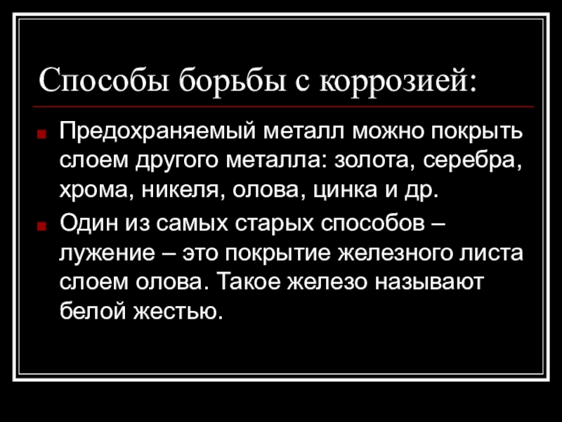 Один из самых старых способов – лужение – это покрытие железного листа слоем олова. Такое железо называют белой жестью.