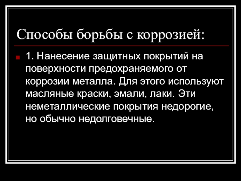 коррозии металла. Для этого используют масляные краски, эмали, лаки. Эти неметаллические покрытия недорогие, но обычно недолговечные.