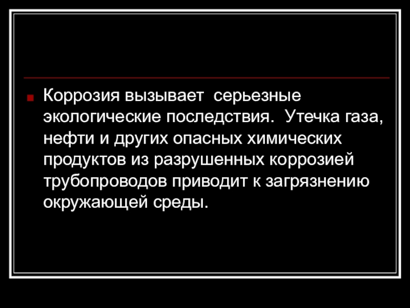 Коррозия вызывает серьезные экологические последствия. Утечка газа, нефти и других опасных