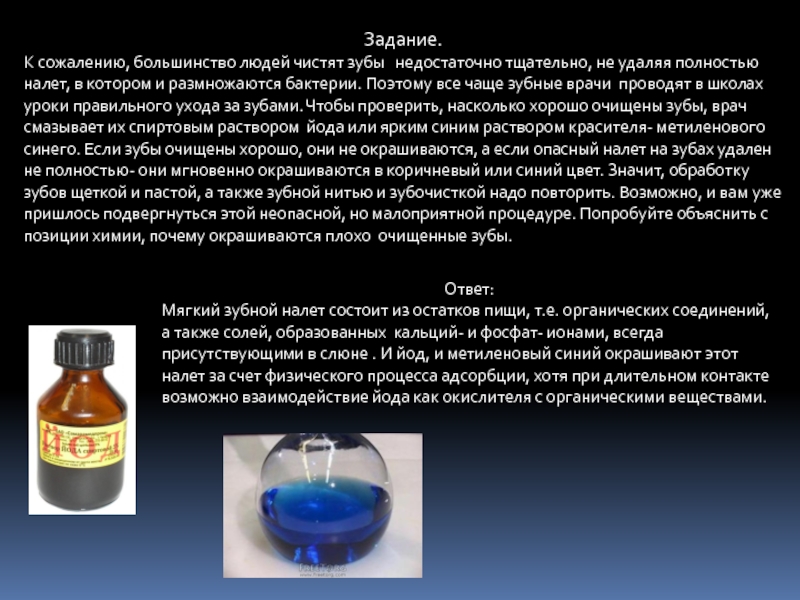 Мягкий зубной налет состоит из остатков пищи, т.е. органических соединений, а также солей, образованных кальций- и фосфат- ионами, всегда присутствующими в слюне . И йод, и метиленовый синий окрашивают этот налет за счет физического процесса адсорбции, хотя при длительном контакте возможно взаимодействие йода как окислителя с органическими веществами.