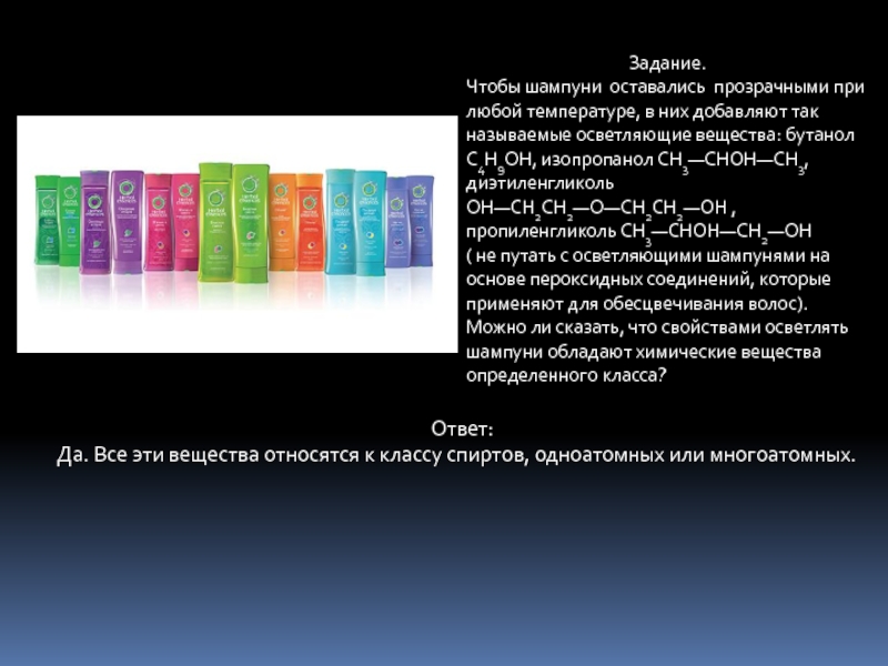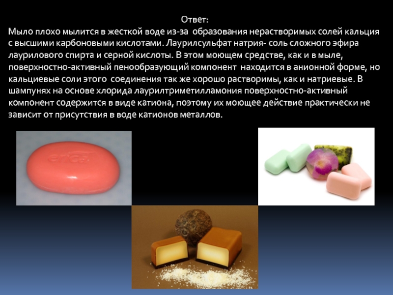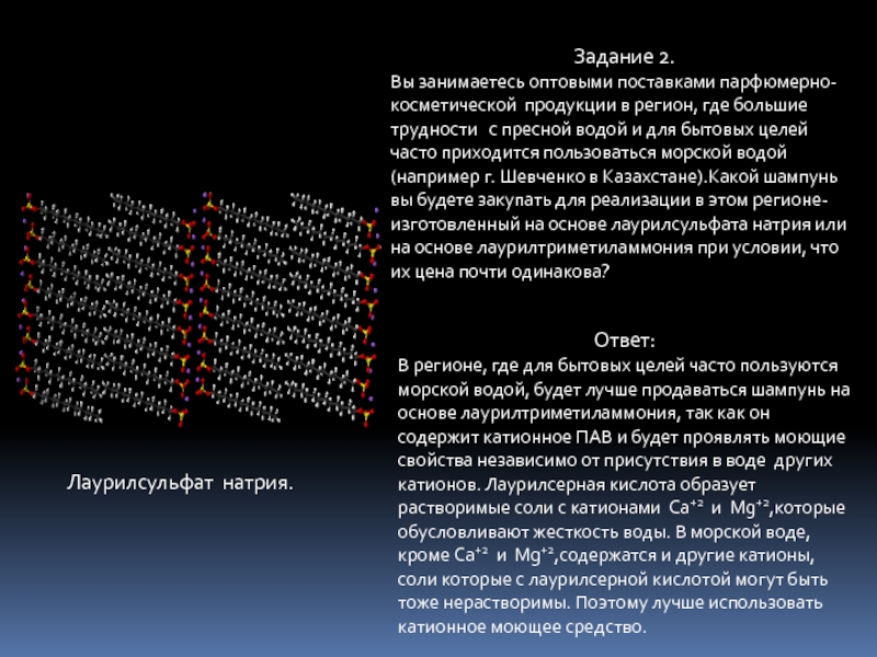 В регионе, где для бытовых целей часто пользуются морской водой, будет лучше продаваться шампунь на основе лаурилтриметиламмония, так как он содержит катионное ПАВ и будет проявлять моющие свойства независимо от присутствия в воде других катионов. Лаурилсерная кислота образует растворимые соли с катионами Ca+2 и Mg+2,которые обусловливают жесткость воды. В морской воде, кроме Ca+2 и Mg+2,содержатся и другие катионы, соли которые с лаурилсерной кислотой могут быть тоже нерастворимы. Поэтому лучше использовать катионное моющее средство.