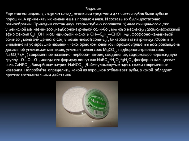 Абразивы- оксиды алюминия Al2O3 и титана TiO2 , очищающий пнообразователь-лаурилсульфат натрия , антисептик-бензойная кислота C6H5COOH, фторсодержащий компонент для профилактики кариеса- монофторфосфат натрия , загуститель-карбоксиметилцеллюлоза, точнее, ее натриевая соль [(C6H7O2)(OH)3-x(OCH2COONa)x]n .
