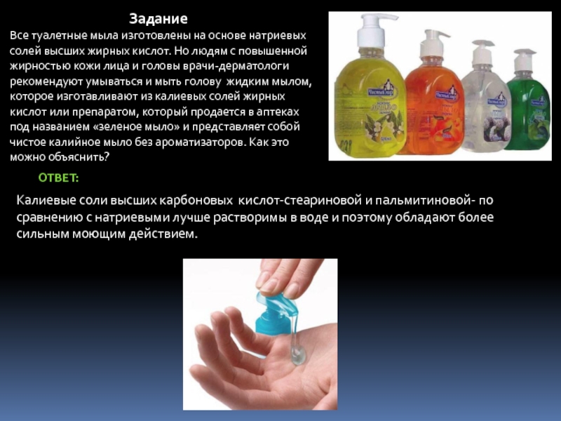 Калиевые соли высших карбоновых кислот-стеариновой и пальмитиновой- по сравнению с натриевыми лучше растворимы в воде и поэтому обладают более сильным моющим действием.
