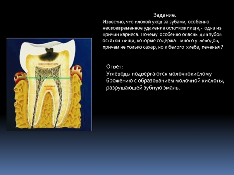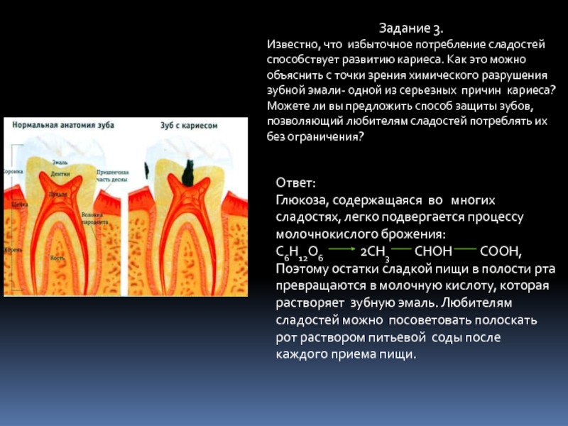 Углеводы подвергаются молочнокислому брожению с образованием молочной кислоты, разрушающей зубную эмаль.