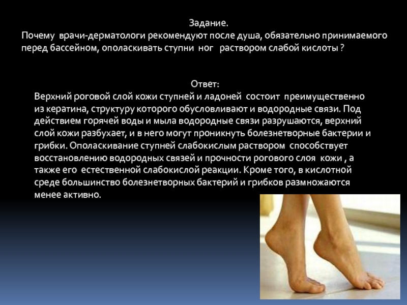 Верхний роговой слой кожи ступней и ладоней состоит преимущественно из кератина, структуру которого обусловливают и водородные связи. Под действием горячей воды и мыла водородные связи разрушаются, верхний слой кожи разбухает, и в него могут проникнуть болезнетворные бактерии и грибки. Ополаскивание ступней слабокислым раствором способствует восстановлению водородных связей и прочности рогового слоя кожи , а также его естественной слабокислой реакции. Кроме того, в кислотной среде большинство болезнетворных бактерий и грибков размножаются менее активно.