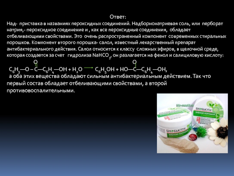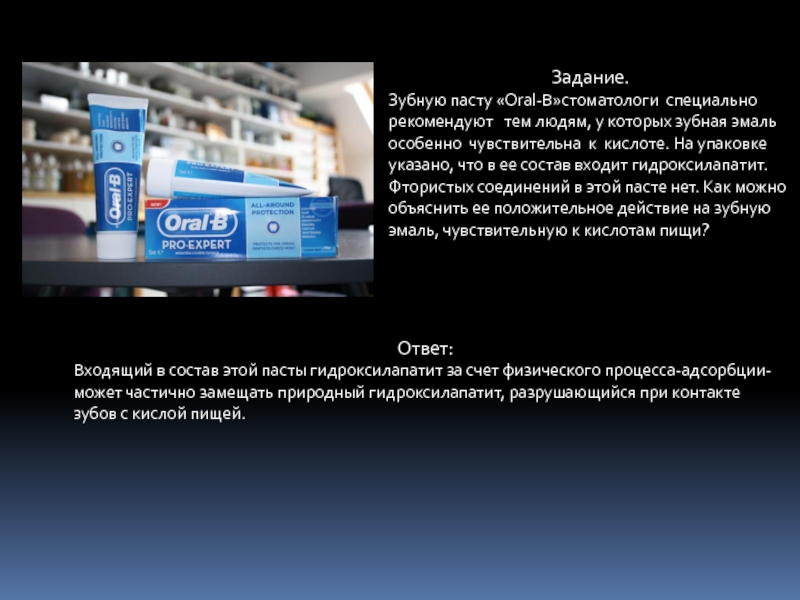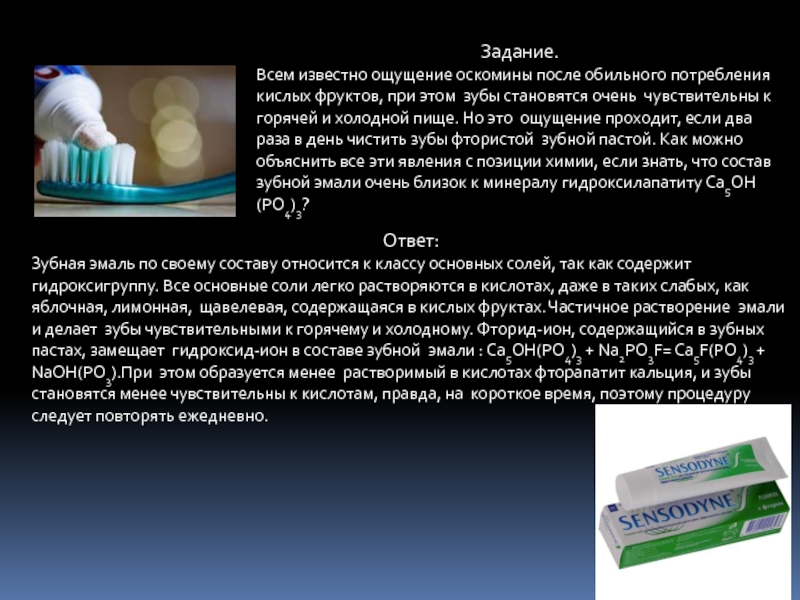 Зубная эмаль по своему составу относится к классу основных солей, так как содержит гидроксигруппу. Все основные соли легко растворяются в кислотах, даже в таких слабых, как яблочная, лимонная, щавелевая, содержащаяся в кислых фруктах. Частичное растворение эмали и делает зубы чувствительными к горячему и холодному. Фторид-ион, содержащийся в зубных пастах, замещает гидроксид-ион в составе зубной эмали : Са5ОН(РО4)3 + Na2PO3F= Ca5F(PO4)3 + NaOH(PO3).При этом образуется менее растворимый в кислотах фторапатит кальция, и зубы становятся менее чувствительны к кислотам, правда, на короткое время, поэтому процедуру следует повторять ежедневно.