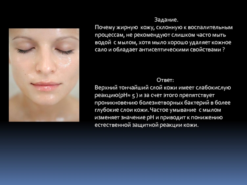 Верхний тончайший слой кожи имеет слабокислую реакцию(рН≈ 5 ) и за счет этого препятствует проникновению болезнетворных бактерий в более глубокие слои кожи. Частое умывание с мылом изменяет значение рН и приводит к понижению естественной защитной реакции кожи.