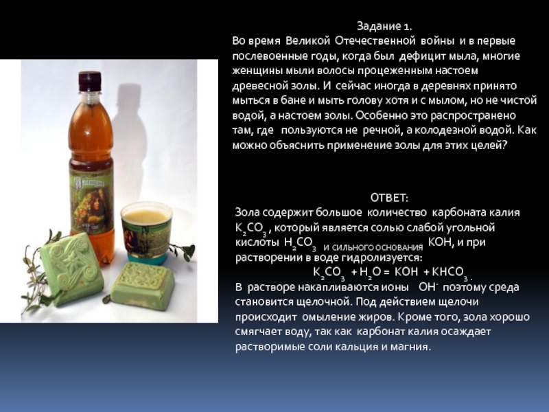 В растворе накапливаются ионы OH- поэтому среда становится щелочной. Под действием щелочи происходит омыление жиров. Кроме того, зола хорошо смягчает воду, так как карбонат калия осаждает растворимые соли кальция и магния.