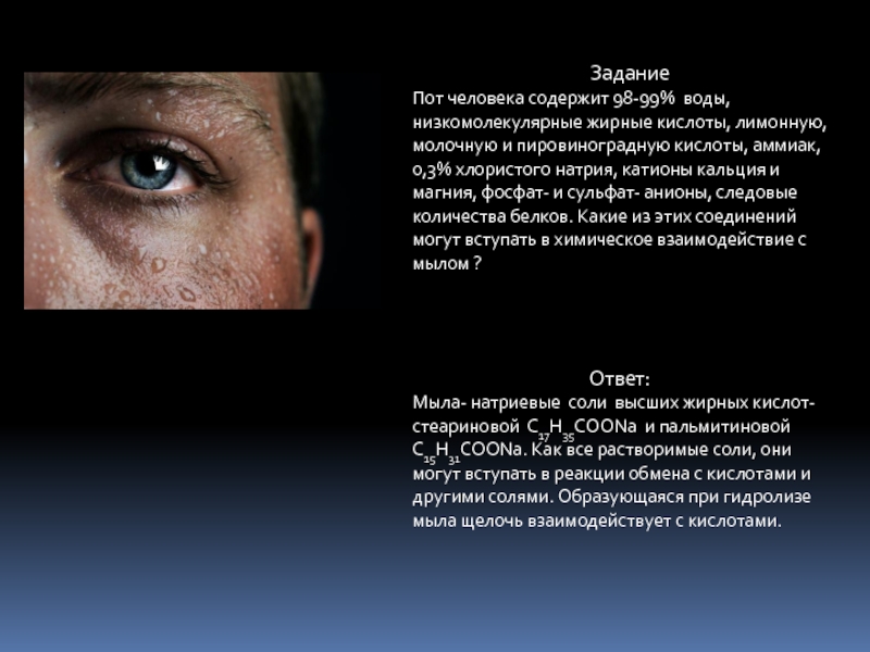 Мыла- натриевые соли высших жирных кислот- стеариновой С17H35COONa и пальмитиновой C15H31COONa. Как все растворимые соли, они могут вступать в реакции обмена с кислотами и другими солями. Образующаяся при гидролизе мыла щелочь взаимодействует с кислотами.