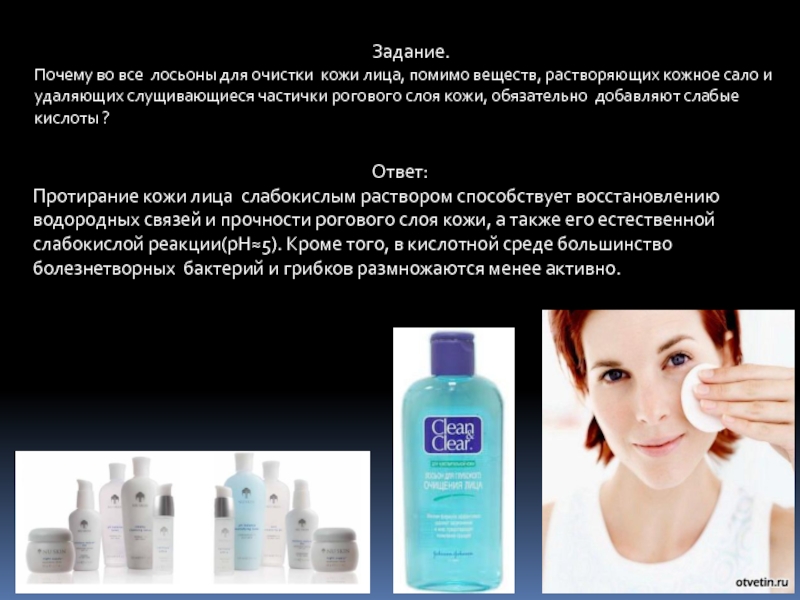 Протирание кожи лица слабокислым раствором способствует восстановлению водородных связей и прочности рогового слоя кожи, а также его естественной слабокислой реакции(рН≈5). Кроме того, в кислотной среде большинство болезнетворных бактерий и грибков размножаются менее активно.