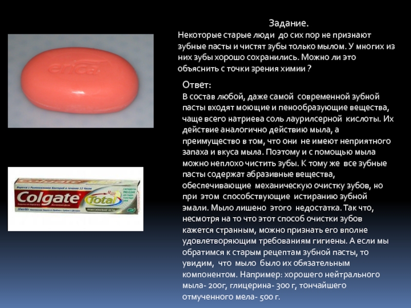В состав любой, даже самой современной зубной пасты входят моющие и пенообразующие вещества, чаще всего натриева соль лаурилсерной кислоты. Их действие аналогично действию мыла, а преимущество в том, что они не имеют неприятного запаха и вкуса мыла. Поэтому и с помощью мыла можно неплохо чистить зубы. К тому же все зубные пасты содержат абразивные вещества, обеспечивающие механическую очистку зубов, но при этом способствующие истиранию зубной эмали. Мыло лишено этого недостатка. Так что, несмотря на то что этот способ очистки зубов кажется странным, можно признать его вполне удовлетворяющим требованиям гигиены. А если мы обратимся к старым рецептам зубной пасты, то увидим, что мыло было их обязательным компонентом. Например: хорошего нейтрального мыла- 200г, глицерина- 300 г, тончайшего отмученного мела- 500 г.