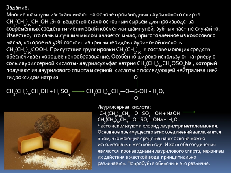 Часто используют и хлорид лаурилтриметиламмония. Основное преимущество этих соединений заключается в том, что моющие средства на их основе можно использовать в жесткой воде. И хотя оба соединения являются производными лаурилового спирта, механизм их действия в жесткой воде принципиально различается. Попробуйте объяснить это различие.