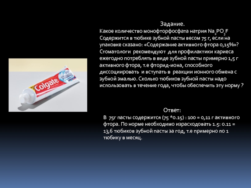 В 75г пасты содержится (75 *0.15) : 100 = 0,11 г активного фтора. По норме необходимо израсходовать 1.5: 0.11 = 13,6 тюбиков зубной пасты за год, т.е примерно по 1 тюбику в месяц.