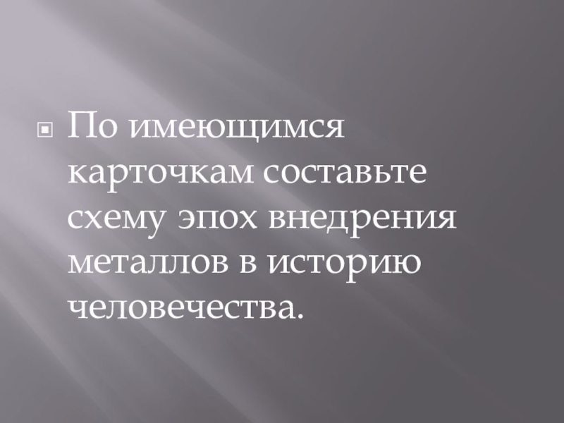 Слайд 3По имеющимся карточкам составьте схему эпох внедрения металлов в историю человечества.