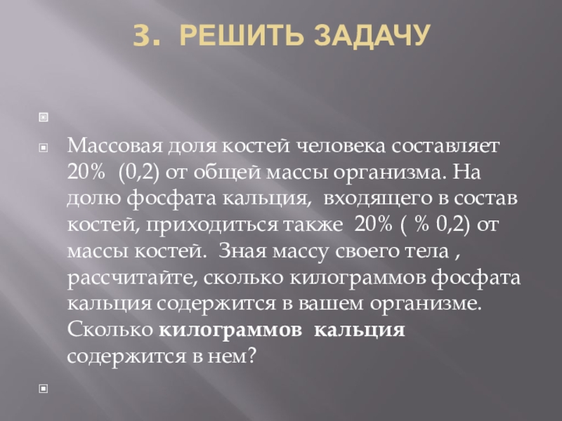 3. РЕШИТЬ ЗАДАЧУ  Массовая доля костей человека составляет 20% (0,2) от общей массы организма. На долю