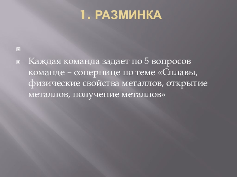 1. РАЗМИНКА Каждая команда задает по 5 вопросов команде – сопернице по теме «Сплавы, физические свойства металлов, открытие металлов, получение металлов»