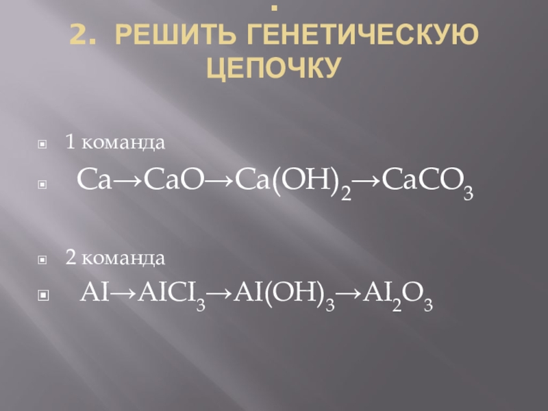 . 2. РЕШИТЬ ГЕНЕТИЧЕСКУЮ ЦЕПОЧКУ 1 команда Са→СаО→Са(ОН)2→СаСО32 команда AI→AICI3→AI(OH)3→AI2O3