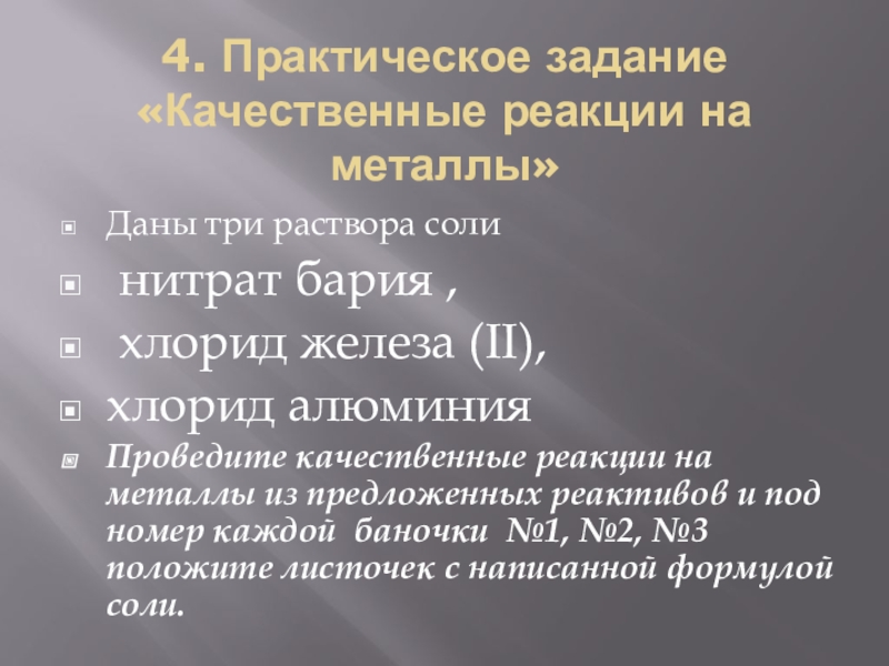 4. Практическое задание «Качественные реакции на металлы»Даны три раствора соли нитрат бария , хлорид железа (II),