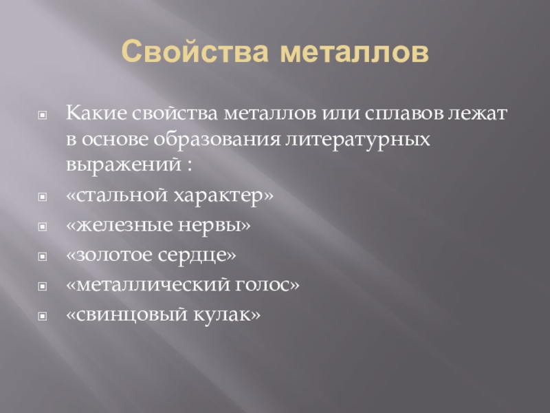 Свойства металловКакие свойства металлов или сплавов лежат в основе образования литературных выражений :«стальной характер»«железные нервы»«золотое сердце»«металлический голос»«свинцовый