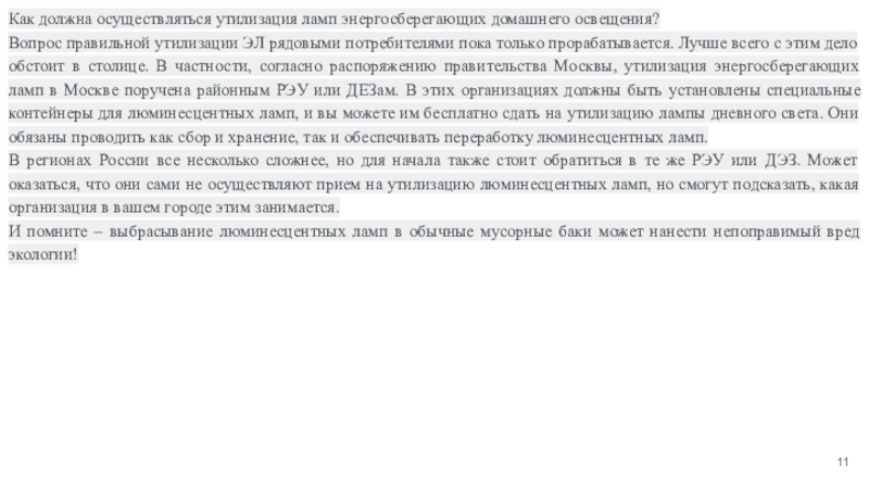 ЭЛ рядовыми потребителями пока только прорабатывается. Лучше всего с этим дело обстоит в столице. В частности, согласно распоряжению правительства Москвы, утилизация энергосберегающих ламп в Москве поручена районным РЭУ или ДЕЗам. В этих организациях должны быть установлены специальные контейнеры для люминесцентных ламп, и вы можете им бесплатно сдать на утилизацию лампы дневного света. Они обязаны проводить как сбор и хранение, так и обеспечивать переработку люминесцентных ламп.