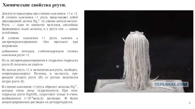 Ртуть- жидкий металл. Ртуть — металл, при комнатной температуре представляющий собой тяжёлую серебристо-белую жидкость, пары которой чрезвычайно ядовиты. Для ртути характерны две степени окисления: +1 и +2. В степени окисления +1 ртуть представляет собой двухъядерный катион Hg2+ со связью металл-металл. Ртуть — один из немногих металлов, способных формировать такие катионы, и у ртути они — самые устойчивые.