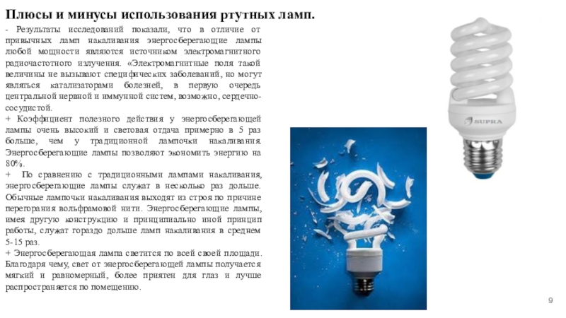 Слайд 9Плюсы и минусы использования ртутных ламп.