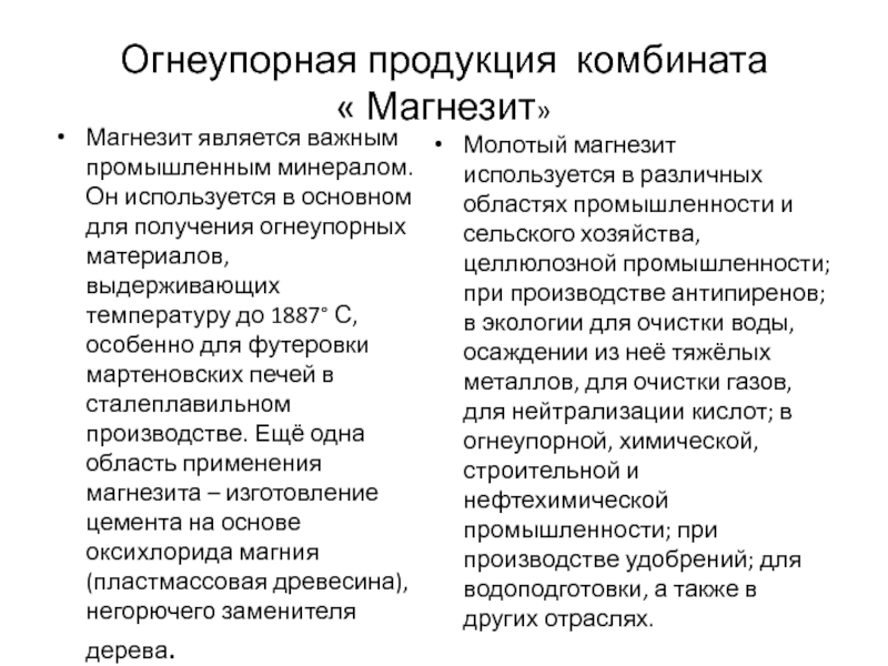 Молотый магнезит используется в различных областях промышленности и сельского хозяйства, целлюлозной промышленности; при производстве антипиренов; в экологии для очистки воды, осаждении из неё тяжёлых металлов, для очистки газов, для нейтрализации кислот; в огнеупорной, химической, строительной и нефтехимической промышленности; при производстве удобрений; для водоподготовки, а также в других отраслях.