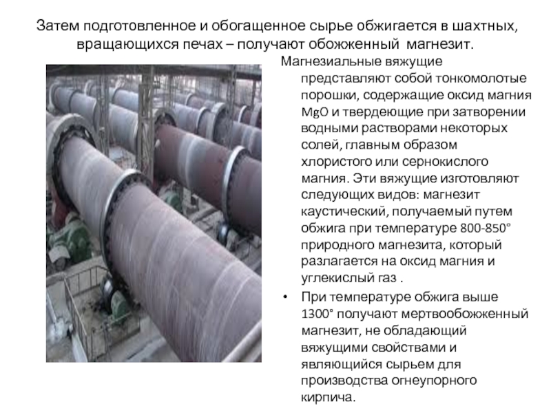 При температуре обжига выше 1300° получают мертвообожженный магнезит, не обладающий вяжущими свойствами и являющийся сырьем для производства огнеупорного кирпича.