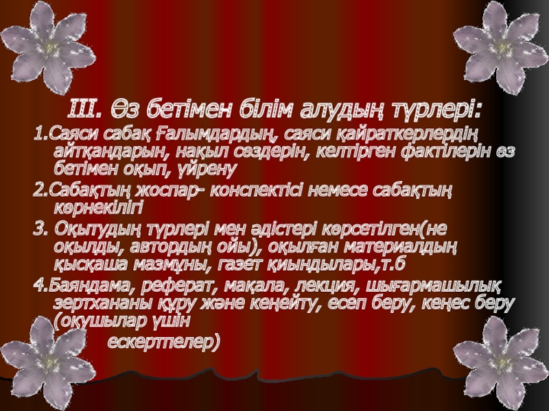 Слайд 5ІІІ. Өз бетімен білім алудың түрлері:
