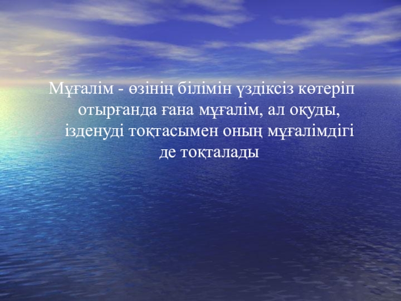 Слайд 18Мұғалім - өзінің білімін үздіксіз көтеріп отырғанда ғана мұғалім, ал оқуды,