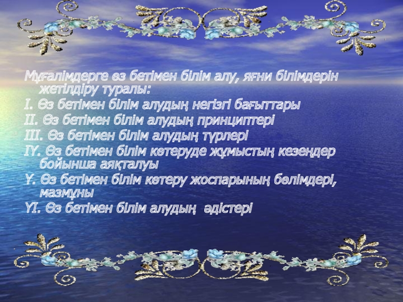 Слайд 7Ү.Өз бетімен білім көтеру жоспарының бөлімдері, мазмұны: