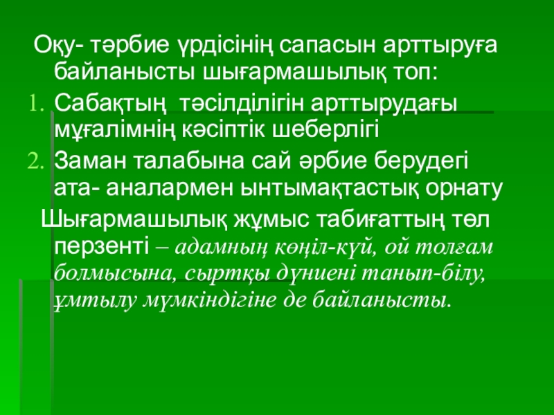 Слайд 10Оқу- тәрбие үрдісінің сапасын арттыруға байланысты шығармашылық топ: