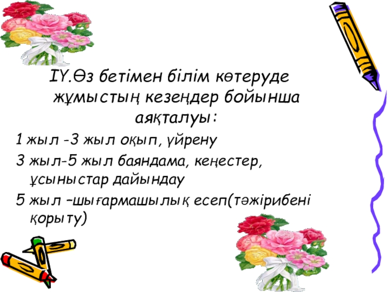 Слайд 6ІҮ.Өз бетімен білім көтеруде жұмыстың кезеңдер бойынша аяқталуы: