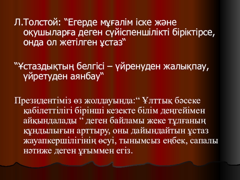 Слайд 16Л.Толстой: “Егерде мұғалім іске және оқушыларға деген сүйіспеншілікті біріктірсе, онда ол