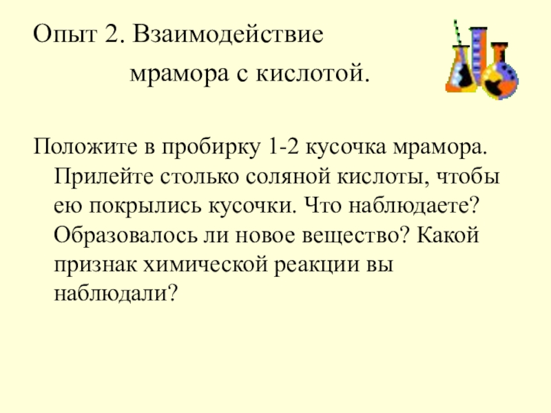 Положите в пробирку 1-2 кусочка мрамора. Прилейте столько соляной кислоты, чтобы ею покрылись кусочки. Что наблюдаете? Образовалось ли новое вещество? Какой признак химической реакции вы наблюдали?
