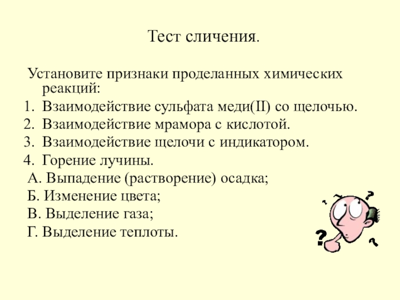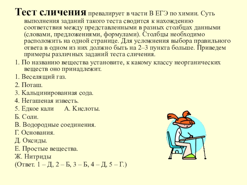 Слайд 9Тест сличения превалирует в части В ЕГЭ по химии. Суть выполнения