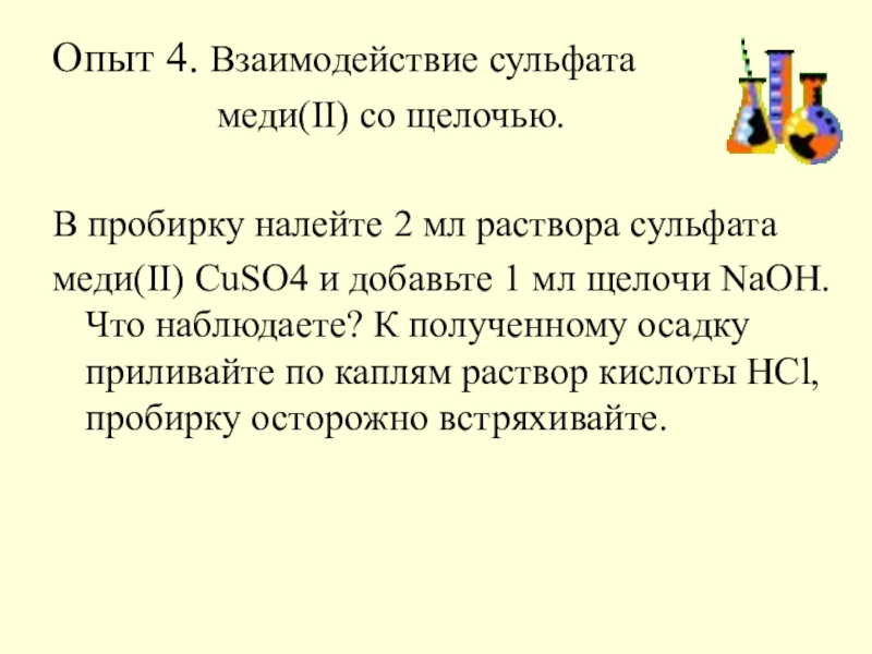 меди(II) CuSO4 и добавьте 1 мл щелочи NaOH. Что наблюдаете? К полученному осадку приливайте по каплям раствор кислоты HCl, пробирку осторожно встряхивайте.
