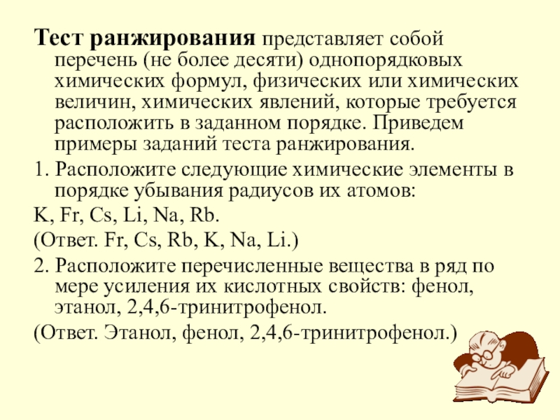 Слайд 8Тест ранжирования представляет собой перечень (не более десяти) однопорядковых химических формул,