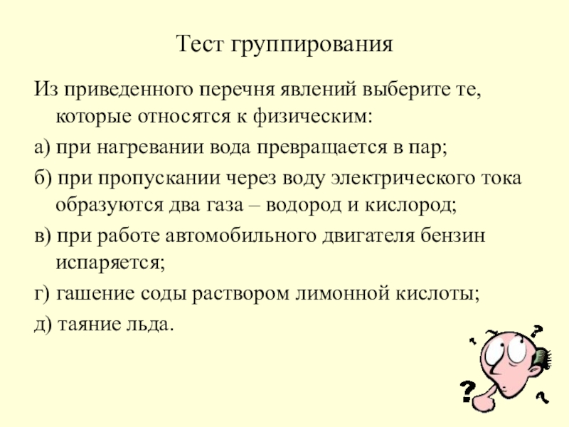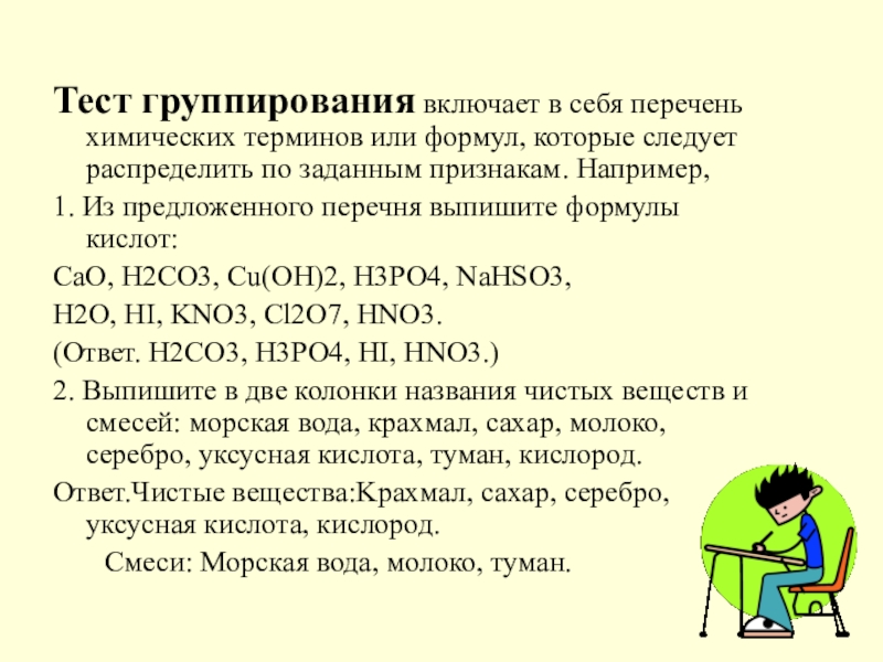 Слайд 7Тест группирования включает в себя перечень химических терминов или формул, которые