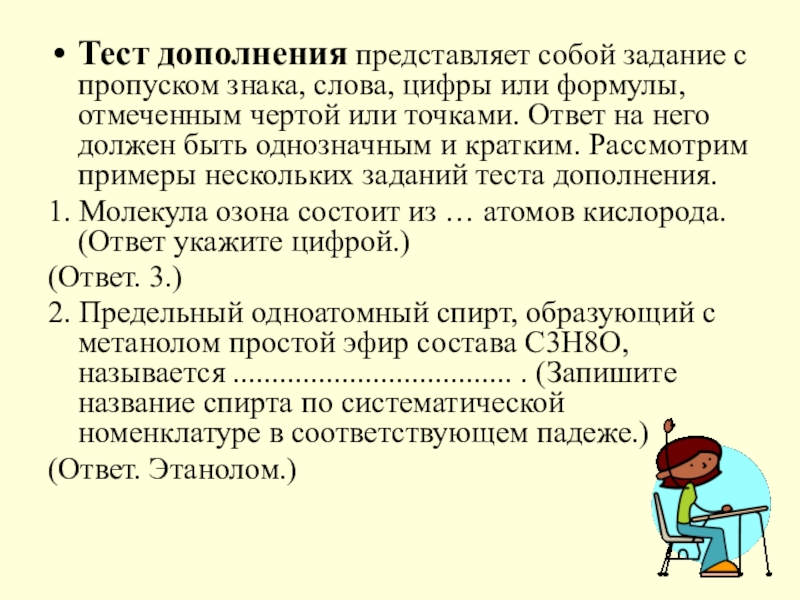 формулы, отмеченным чертой или точками. Ответ на него должен быть однозначным и кратким. Рассмотрим примеры нескольких заданий теста дополнения.