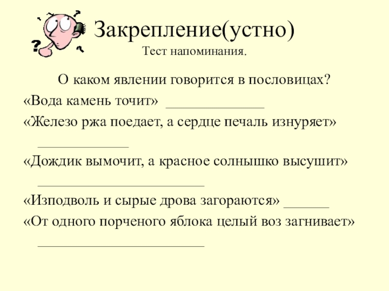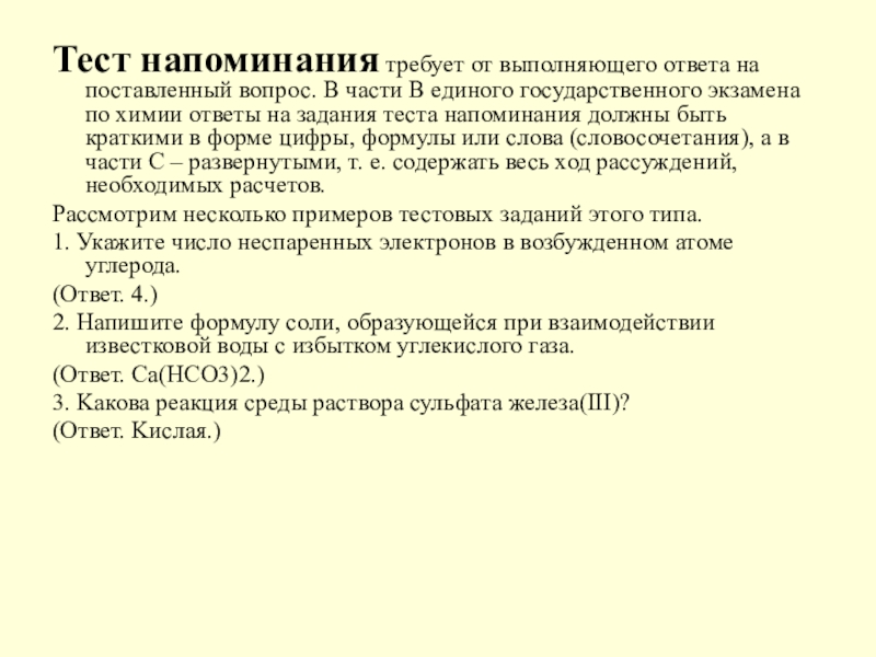 Слайд 10Тест напоминания требует от выполняющего ответа на поставленный вопрос. В части