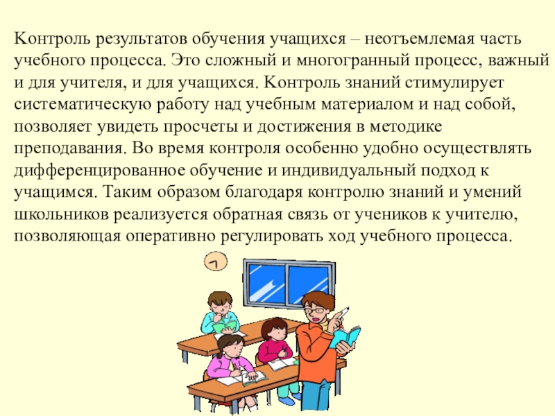 Kонтроль результатов обучения учащихся – неотъемлемая часть учебного процесса. Это сложный и многогранный процесс, важный и для учителя, и для учащихся. Kонтроль знаний стимулирует систематическую работу над учебным материалом и над собой, позволяет увидеть просчеты и достижения в методике преподавания. Во время контроля особенно удобно осуществлять дифференцированное обучение и индивидуальный подход к учащимся. Таким образом благодаря контролю знаний и умений школьников реализуется обратная связь от учеников к учителю, позволяющая оперативно регулировать ход учебного процесса.