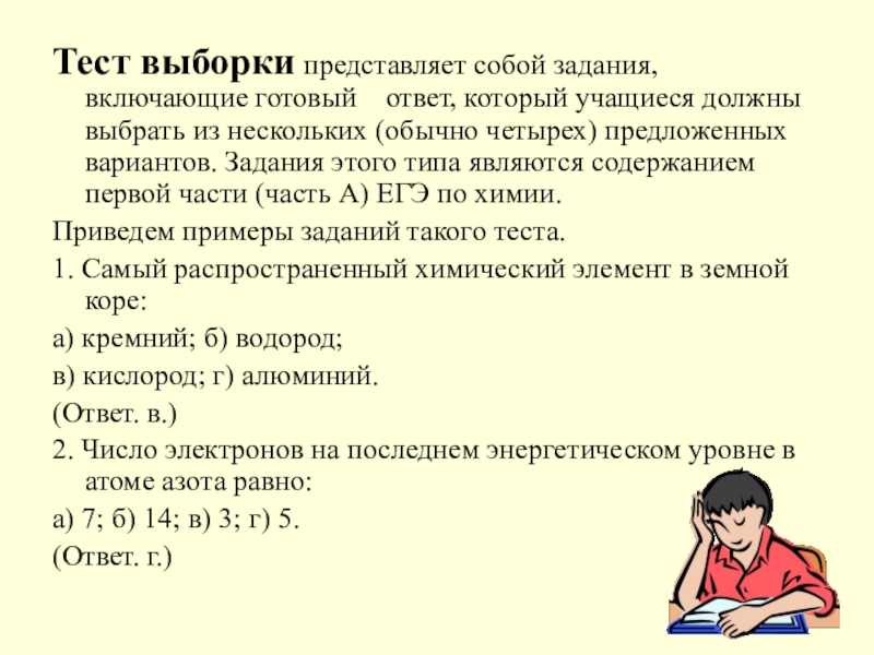 Слайд 5Тест выборки представляет собой задания, включающие готовый ответ, который учащиеся