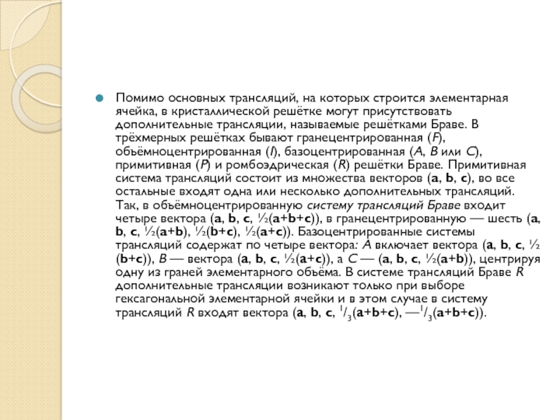 Слайд 4Помимо основных трансляций, на которых строится элементарная ячейка, в кристаллической решётке