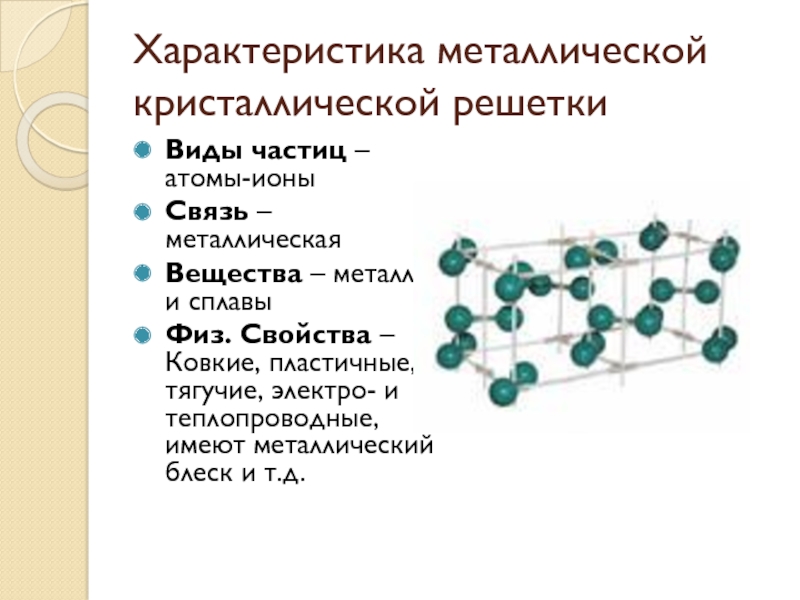 Физ. Свойства – Ковкие, пластичные, тягучие, электро- и теплопроводные, имеют металлический блеск и т.д.